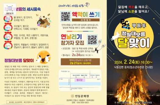 올해 정월대보름은 2월 24일(토)로 도내에서는 포항, 안동, 영천, 경산, 청도 등지에서 달집태우기, 민속놀이, 풍물 공연 등 정월대보름 행사*가 개최된다.