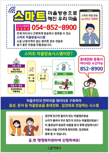 안동시는 2023년 12월 26일부로 2억6천4백만 원을 들여 스마트 마을방송시스템 구축을 완료했으며 1~2월에는 스마트마을방송 이장 운용 교육과 동시에 주민동의를 구해 현재 14개 읍·면, 279개 마을, 8,152명이 가입해 스마트 마을방송 서비스를 시행하고 있다.