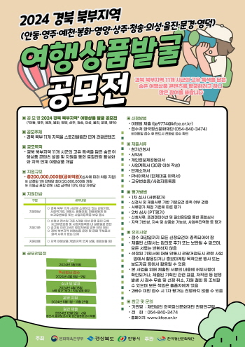경북 북부지역의 특색있고 차별화된 매력을 널리 알려 관광객 유치를 확대하기 위해 진행되는 이번 공모전은 안동, 영주, 예천, 봉화, 영양, 상주, 청송, 의성, 울진, 문경, 영덕의 매력을 충분히 살리면서 관광 트렌드를 반영한 상품이면 응모가 가능하고 2차에 걸친 심사를 통해 1개 기업 혹은 단체당 최대 2천만 원이 지원된다.