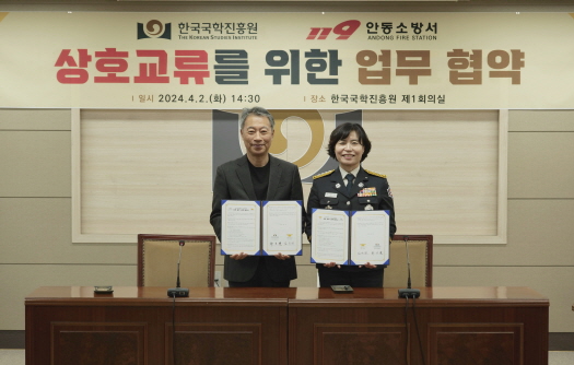 한국국학진흥원은 4월 2일(화) 본원 제1회의실에서 안동소방서(서장 김난희)와 ‘상호 교류를 위한 업무 협약(MOU)’을 체결했다.