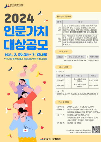 (재)한국정신문화재단(대표이사 이동원)은 인문가치를 통해 개인 삶의 질 제고와 공동체 회복으로 따뜻한 사회 형성에 기여한 ‘2024 인문가치대상’ 수상 후보자를 공모한다.