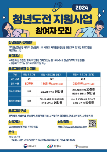 안동시(시장 권기창)는 청년의 구직의욕을 높이고 사회 진출을 돕는 ‘2024년 청년도전지원사업’ 참여자를 모집한다. 시는 2월 고용노동부 주관 '2024년 청년도전지원사업' 공모에 선정돼 약 4억2천만 원의 국비를 확보한 바 있다.