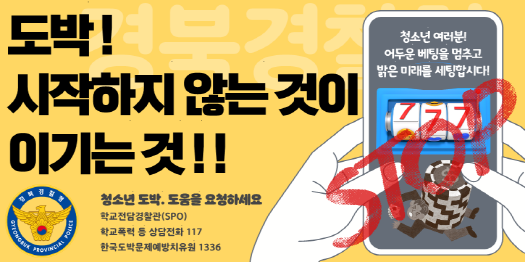 • 경북경찰청은 이번 달부터 7월말까지 3개월 동안을 ‘청소년 도박 예방 및 재범방지 집중활동 기간’으로 설정하고 청소년 도박 근절에 전방위적 역량을 집중할 계획이다.