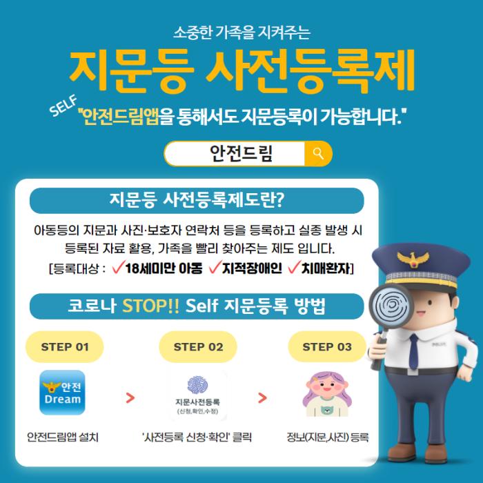 코로나19로 인해 방문하는 것이 어려운 경우 비대면으로 가정 내에서 지문등록 앱 “안전드림”을 이용하여 간단하게 지문 사전등록을 할 수 있다