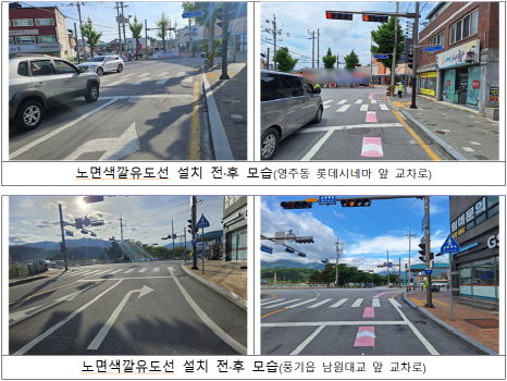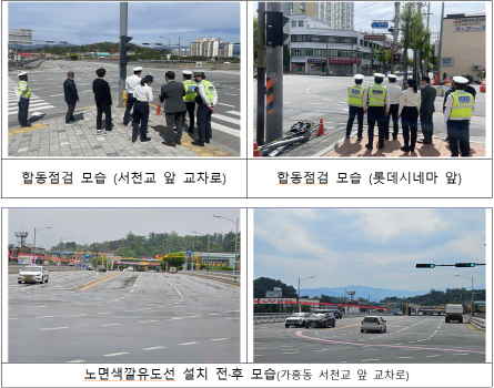 교차로 내에서 차선이 줄어들거나 차선변경이 빈번히 이뤄지는 장소 및 진입금지 표시가 없는 곳에 대해 각각 노면색깔 유도선과 진입금지 노면 표시를 설치하는 등 사업비 약 500만원을 들여 최근 개선사업을 완료했다.