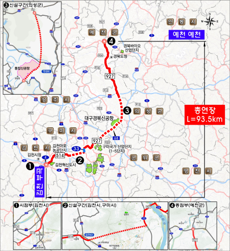 이달 11일 국토교통부 고시에 따라 일반국도로 승격된 지방도927호선은 김천시 덕곡동에서 예천군 예천읍 구간의 총연장 93.5km 도로로, 김천→구미 국가산단→대구경북신공항→경북도청에 이어 예천읍을 연결하는 주요 간선 도로망이 될 것으로 기대된다.