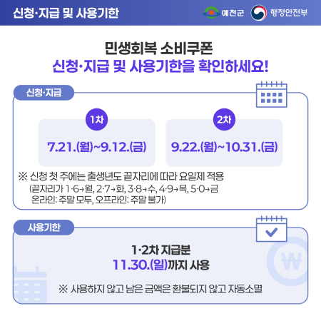 소비쿠폰 신청은 7월 21일 오전 9시부터 9월 12일 오후 6시까지 온·오프라인으로 신청 가능하며, 신용·체크카드 또는 예천사랑상품권(모바일, 지류형, 카드형) 중 원하는 방식을 선택할 수 있다.