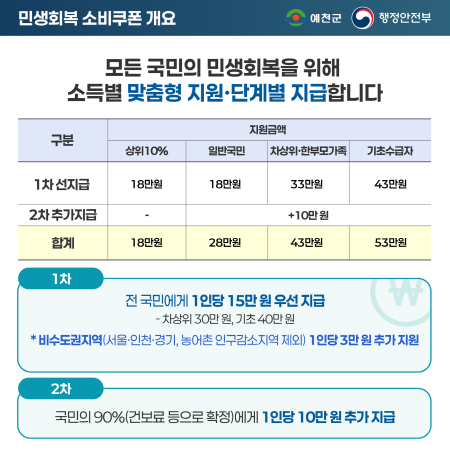 1차 지급 기간은 이달 21일부터 9월 12일까지이며, 예천은 인구감소지역에서 제외되어 추가지급액 3만원으로 ▲일반 군민 18만 원 ▲차상위계층·한부모가족 33만 원 ▲기초생활수급자 43만 원이 지급된다.