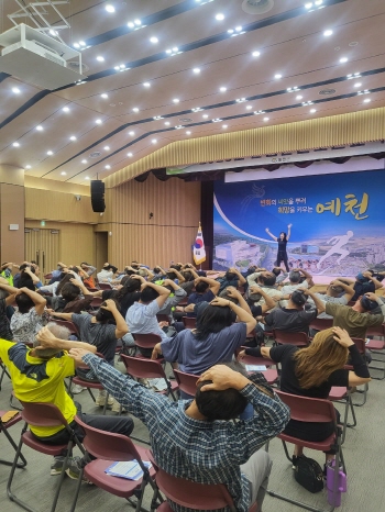 이에 앞서 예천군은 사무실 체조의 효과적인 정착을 위해 22일, 군청 대강당에서 사전 교육을 실시했다. 스트레칭 12개 동작에 대한 시범과 함께 직접 동작을 익히고 실습하며 직원들의 흥미를 높이고 참여 의지를 다지는 시간이 되었다.