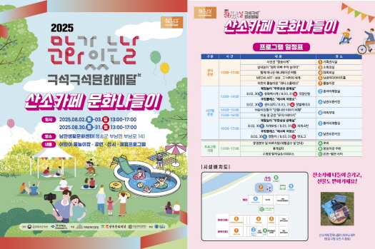 (재)청송문화관광재단(이사장 윤경희)은 여름방학을 맞이하여 오는 8월 2일(토)~3일(일), 8월 30일(토)~31일(일) 총 4일간, 남관생활문화센터(청송군 부남면 부남로 14) 일원에서「2025 문화가 있는 날 – 구석구석 문화배달」‘산소카페 문화나들이’ 행사를 개최한다.