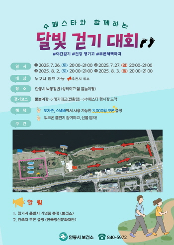 안동시는 7월 26일부터 8월 3일까지 진행되는 ‘2025 안동 수(水)페스타’ 축제기간 중 ‘달빛걷기대회’를 개최한다.
