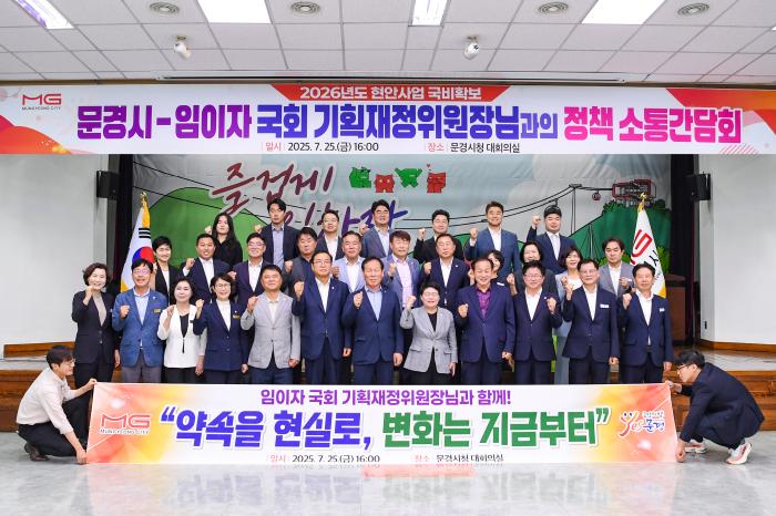 문경시는 7월 25일 시청 대회의실에서 임이자 국회 기획재정위원장과 함께 신현국 문경시장, 이정걸 문경시의회 의장, 시·도의원, 국소장 및 실단과소장 등 80여 명이 참석해 민선8기 핵심 현안사업 점검 및 2026년도 국·도비 확보 전략 마련을 위한 정책소통 간담회를 개최했다.