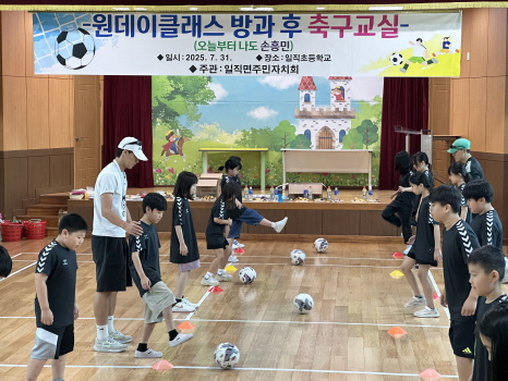 일직초등학교(교장 김성택)는 7월 31일 본교 강당에서 ‘원데이클래스 방과후 축구교실’을 실시했다.