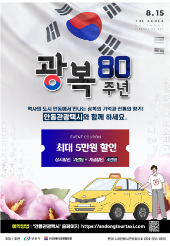 안동시와 (사)안동시관광협의회는 광복 80주년을 맞아 8월 4일부터 8월 31일까지 관광택시 이용객을 대상으로 요금 3만 원 할인이벤트를 진행한다.