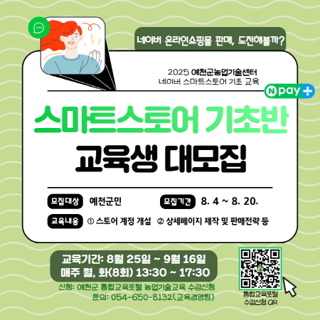 예천군(군수 김학동)은 군민 24명을 대상으로 이달 25일부터 9월 16일까지 총 8회에 걸쳐 스마트스토어 기초 교육을 실시한다. 스마트스토어란 네이버의 온라인쇼핑몰으로, 개인이 손쉽게 상품을 등록하고 판매할 수 있는 대표적인 이커머스 플랫폼이다.