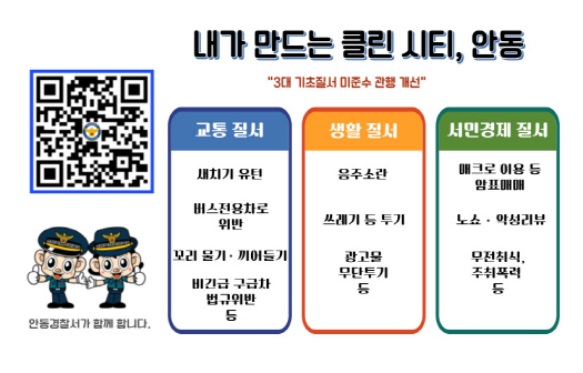 안동경찰서는 기초질서에 대한 안내 QR코드가 삽입된 홍보 이미지를 활용, 시민들이 보다 쉽게 이해하고 많은 관심을 가질 수 있도록 하였으며 지방세 고지서가 집집마다 배부되는 점을 이용하여 안동시민에게 전달함으로써 “내가 만드는 클린 시티, 안동”에 걸맞는 정책을 추진한다.