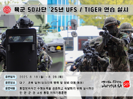 육군 50보병사단은, 오는 8월 18일(월)부터 28일(목)까지 통합방위태세 확립을 위해 '25년 UFS 연습을 실시한다.