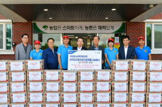 이번 행사는 관내 농·축협이 뜻을 모아 기탁한 700만 원 상당의 우리 쌀 가공제품(쌀국수 등)을 외국인 계절근로자들에게 전달하는 자리로, 무더위 속에서 영농 현장을 지키는 근로자들의 노고를 격려하고 우리쌀 소비 확대를 도모하기 위해 마련됐다.