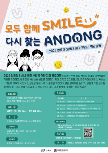 안동시와 (사)안동시관광협의회는 9월 4일(목)까지 ‘2025 안동형 SMILE 씨앗 뿌리기 역량강화’ 교육에 참가자를 모집한다.