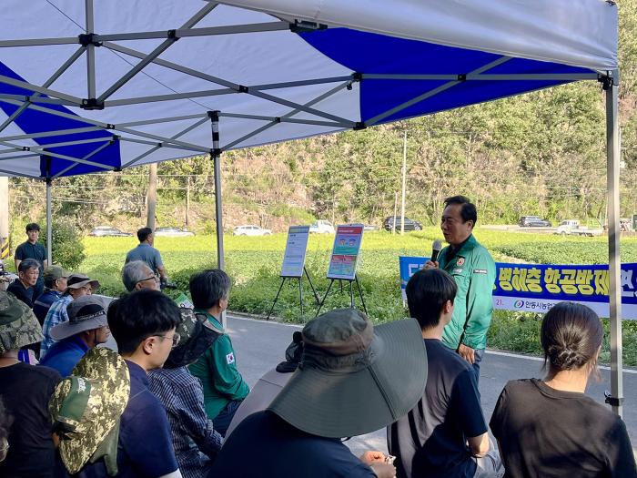 안동시는 8월 21일(목) 남선면 구미리 콩 재배포장에서 ‘콩 병해충 항공방제 연시회’를 개최했다.