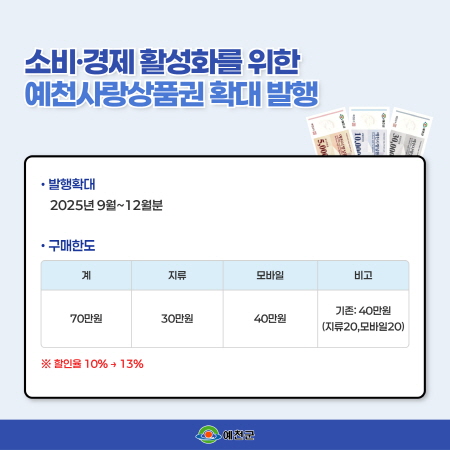 구매 한도와 혜택도 강화된다. 개인별 구매 상한을 기존 월 40만 원(지류 20만 원, 모바일 20만 원)에서 월 70만 원(지류 30만 원, 모바일 40만 원)으로 확대하고, 할인율도 10%에서 13%로 높여 군민들이 더 많은 혜택을 체감할 수 있도록 했다.