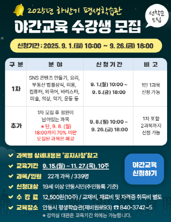 안동시 평생학습관은 오는 9월 1일(월)부터 2025년 하반기 야간교육 수강생을 모집한다.