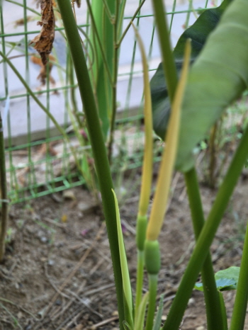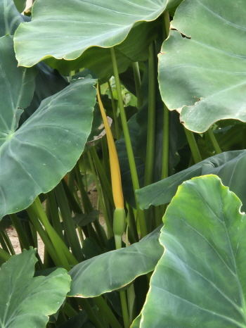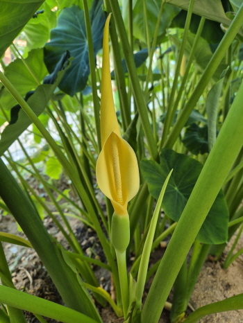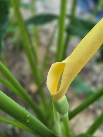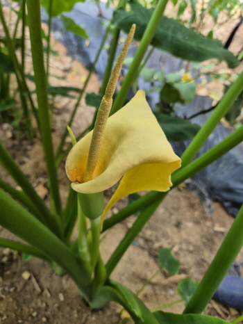토란 한 줄기에 두 대의 꽃대가 피어 오르는 토란꽃. 사진제공/권태인