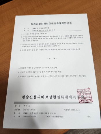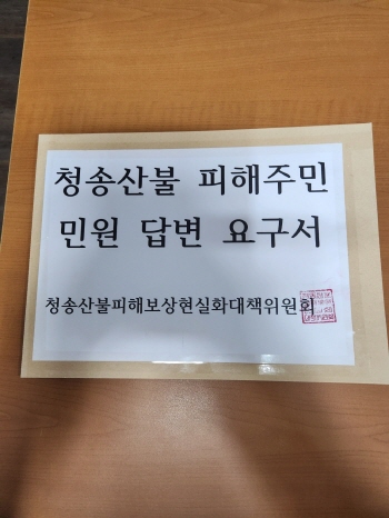 청송산불피해보상현실화대책위원회(이하 대책위원회. 위원장 박주윤)는 2025년 9월 8일 청송군과 청송군의회를 찾아 '청송산불 피해주민 민원 답변 요구서'를 전달했다.