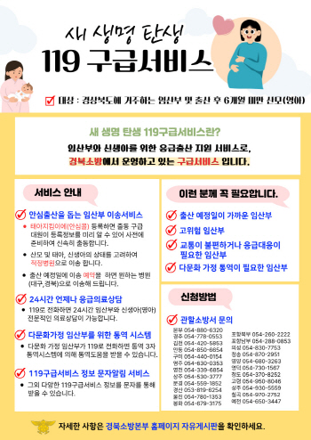 ‘새 생명 탄생 119구급서비스’는 2020년 1월부터 경상북도 전역에서 추진 중인 시책으로 임산부 출산·진통·출혈 등 긴급 상황 발생 시 응급처치와 함께 거동이 불편한 임산부의 병원 이송을 지원하는 맞춤형 구급서비스다.