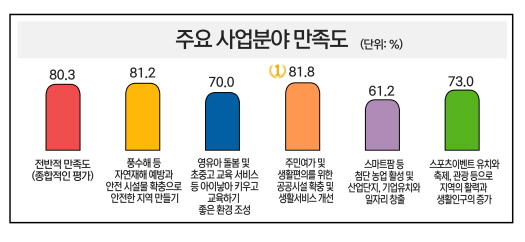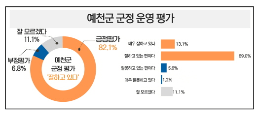 조사 결과, 응답자의 82.1%가 예천군의 군정 운영을 ‘잘하고 있다’고 평가했으며, 긍정적으로 평가한 응답자의 81.8%가 ‘주민 여가와 생활편의를 위한 공공시설 확충, 생활서비스 개선’ 분야에서 가장 높은 만족도를 보였다.