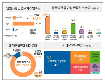 예천군 정주여건 중 가장 만족하는 분야는 주거환경 및 행정서비스로 43.5%가 긍정적으로 답했으며, 주민 소통과 업무처리에서는 ‘민원소통 및 업무처리에 만족한다’라는 응답이 84.5%로 나타났고, 군정성과에서는 문화・관광・체육 분야에 36.2%, 지역개발 분야에서는 34.1%로 긍정적인 평가를 받았다.