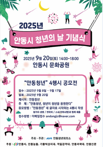 한편, 기념식에 앞서 ‘청년이 청년을 응원한다’라는 주제로 ‘안동청년’ 4행시 공모전을 진행하고 있다. 응모는 금일 17일(수)까지 이메일(andongjc@naver.com)을 통해 접수 가능하며, 청년정책에 관심 있는 누구나 참여할 수 있다. 수상작은 기념식 당일 현장에서 발표될 예정이다.