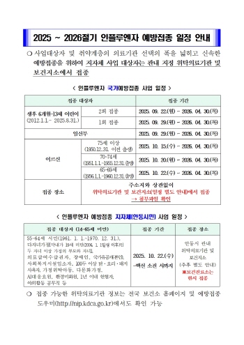 국가 무료접종 대상은 ▲생후 6개월~13세 어린이 ▲임신부 ▲65세 이상 어르신이며, 대상별 접종 시기는 2회 접종 어린이(생애 첫 접종 어린이) 대상자는 9월 22일부터, 1회 접종 어린이 대상자와 임신부는 9월 29일부터 시작한다.