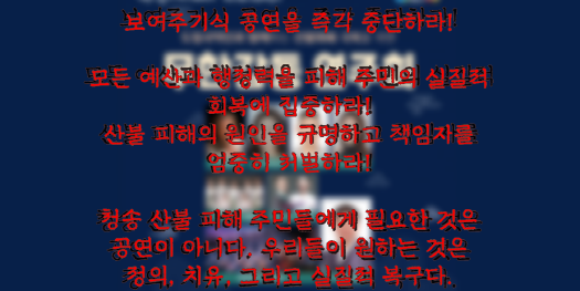 우리는 ‘청송 산불 피해 극복을 위한 무한 감동 공연’의 개최에 분노한다.