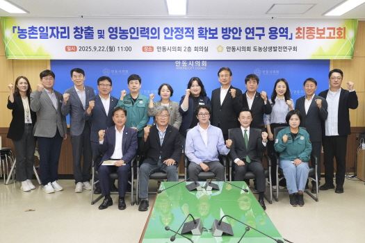 안동시의회 의원연구단체인 도농상생발전연구회(회장 김창현)는 22일 안동시의회 2층 회의실에서「농촌일자리 창출 및 영농인력의 안정적 확보 방안」연구용역 최종보고회를 개최했다.