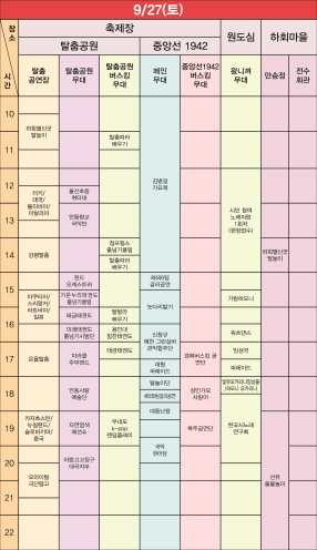 원도심과 하회마을에서도 공연이 이어진다. 원도심 무대에서는 거리예술과 시민참여 무대가 진행되고, 하회마을에서는 하회별신굿탈놀이 공연이 펼쳐져, 탈춤의 역사와 현재를 동시에 체험할 수 있다. 저녁에는 하회선유줄불놀이도 준비돼있다.