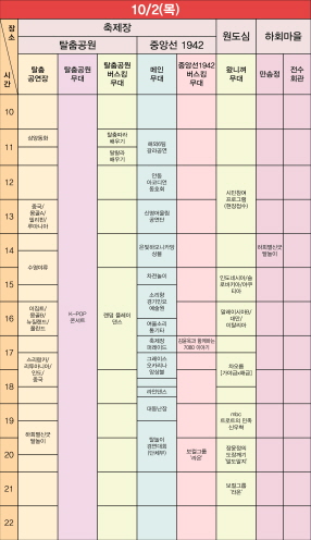 이날 오후 2시 30분에는 수영야류가 탈춤공연장 무대에 올라 남도 특유의 해학과 흥겨움을 전한다. 저녁 7시에는 같은 무대에서 유네스코 인류무형문화유산인 하회별신굿탈놀이가 공연돼, 한국 탈춤의 정수를 가까이서 만날 수 있다.