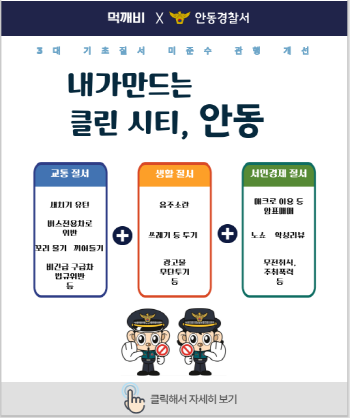 이뿐만 아니라 안동경찰서는 지난 달 안동시청과 협업, 재산세 고지서에 “3대 기초질서(▵교통 질서 ▵생활 질서 ▵서민경제 질서) 미준수 관행 개선” 관련 홍보 이미지를 삽입하는 등 기초질서 준수 유도에 앞장서고 있다.