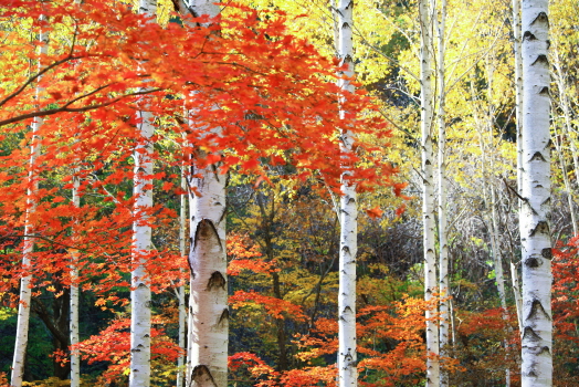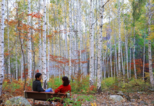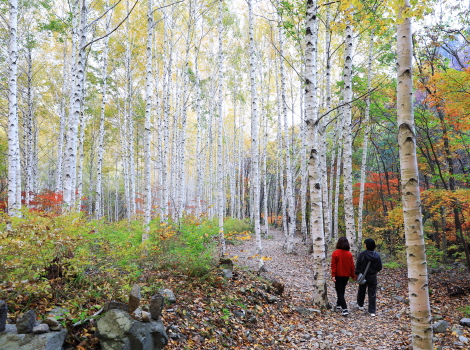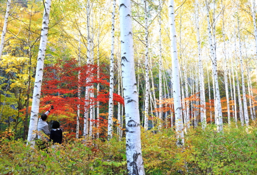 빼곡하게 뻗은 나무의 하얀 수피들 사이로 붉게 피어오른 단풍은 늘상 봐오던 단풍나무들과는 색다른 감동을 선사할 것이다.