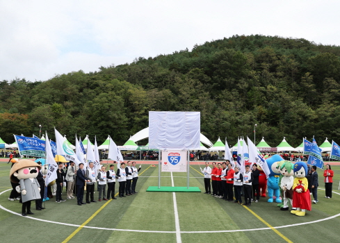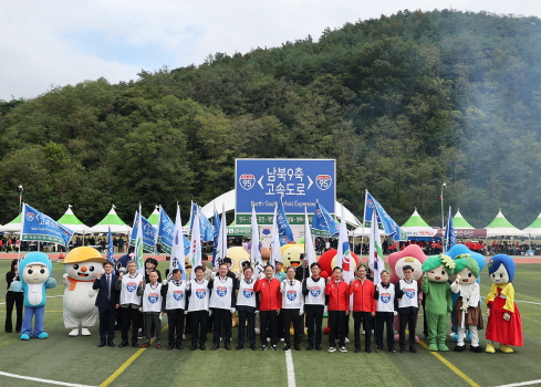 행사는 ‘남북9축, 함께 잇다’ 슬로건 아래 강원·경북 10개 시‧군 대표단이 운동장 양 끝에서 동시에 출발, 중앙에 위치한 제막무대에서 하나로 모여 ‘남북9축 고속도로’ 표지판을 공동 제막하는 순으로 진행됐다.