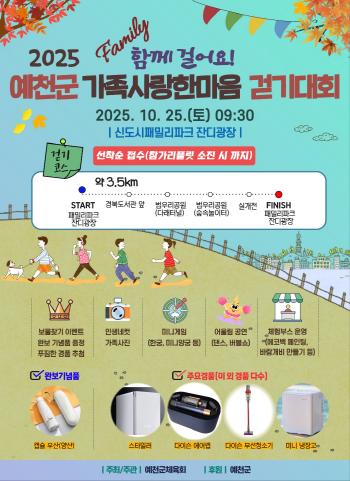 예천군(군수 김학동)에서는 오는 25일 오전 9시 30분부터 호명읍 신도시패밀리파크 잔디광장에서 ‘2025 예천군 가족사랑한마음 걷기대회’ 가 열린다.