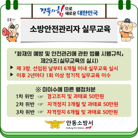 이에 따라 안동소방서와 한국소방안전원에서는 소방안전관리자의 실무교육 이수를 독려하기 위해 교육일자 도래 시 문자, 등기우편, 유선 등을 통한 안내를 정기적으로 실시하고 있다.