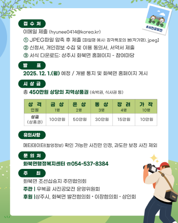 상주시 화북면은 조선십승지 주민협의회에서 주최하는 ‘2025 조선십승지 우복골 사계 전국 사진 공모전’ 작품을 10월 27일(월)부터 11월 14일(금)까지 접수한다.