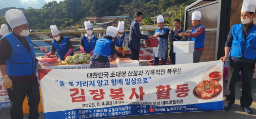 산불로 폐허가 된 영양산불피해민들을 돕겠다며 보내 준 전 국민적인 성원에 가만히 있어선 안되겠다는 산불피해 주민들의 결의가 모여져 2025년 11월 4일 경남 산청읍 내부리를 찾아 김장나눔 봉사활동에 나섰다는 감동적인 이야기를 전한다,