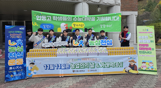안동고등학교(교장 김태동)는 2026학년도 대학수학능력시험(수능)을 앞두고 11일 '가래떡 데이'를 맞아 경북농협본부에서 본교 3학년 수험생들을 찾아 '수능 대박 기원 가래떡 나눔 행사'를 가졌다고 밝혔다.