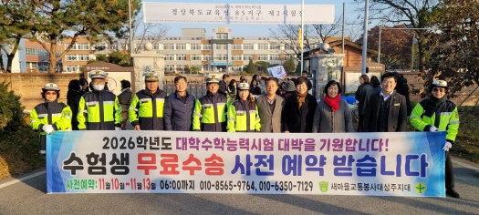 상주시 새마을교통봉사대(대장 고일환)는 13일 6시부터 8시 40분까지 2026학년도 대학수학능력시험 수험생 수송지원 및 교통봉사활동을 실시했다.
