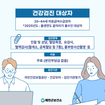 예천군(군수 김학동)은 취약계층의 질병예방과 건강증진을 위해 의료급여수급권자를 대상으로 일반건강검진을 무료로 지원한다.