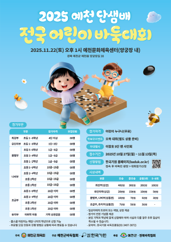 예천군체육회가 주최하고 (재)한국기원과 예천군바둑협회가 주관하는 이번 대회는 전국의 어린 바둑 인재 350여 명과 심판·관계자, 학부모 등 총 1,000여 명이 참가하여 바둑 열기로 대회장을 가득 메울 전망이다.
