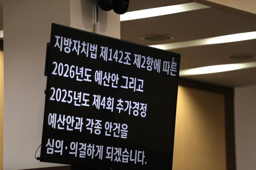 12월 19일 (금) [14:00] | 제 3 차 본 회 의 | 1. 2025년도 행정사무감사 결과보고서 채택의 건 2. 각종 안건 의결 3. 2026년도 예산안 4. 2026년도 기금운용계획안 5. 2025년도 제4회 추가경정 예산안 6. 2025년도 제4회 기금운용계획 변경안 7. 기타 안건 -------------------------------------- 폐 회 | 1일간 |