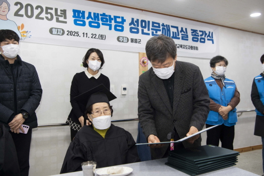울릉군은 22일(토) 송담양로원 어르신들과 울릉군평생교육지도자협의회 관계자 등 25여 명이 참석한 가운데 '2025년 평생학당 성인문해교실 종강식'을 개최했다